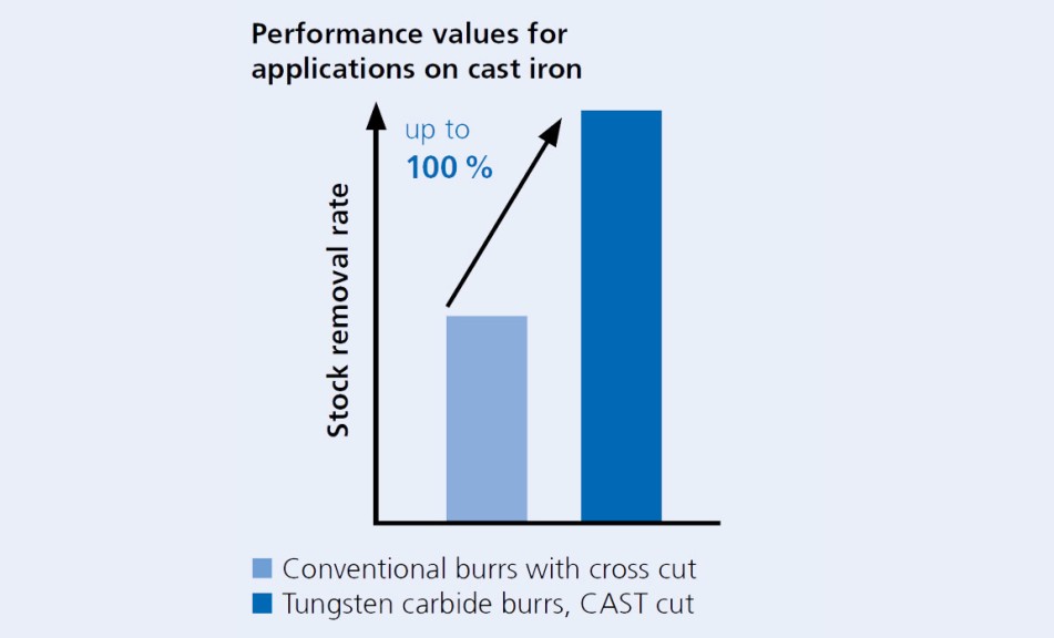 - Up to 100 % higher stock removal rate when used on cast iron due to the innovative tooth geometry, when compared with conventional cross-cut burrs.