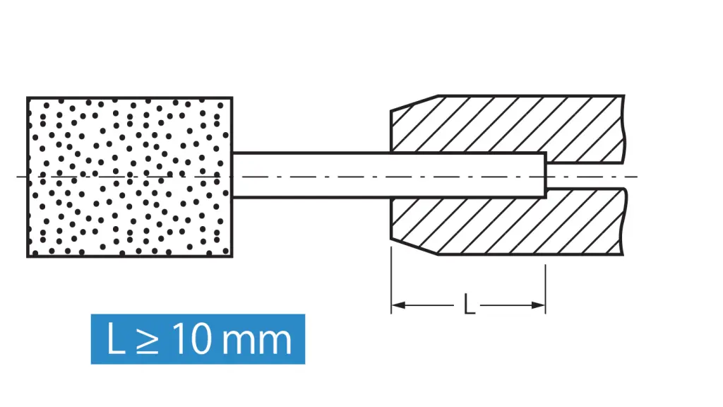 Strong centrifugal forces will already occur when working at the recommended rotational speeds. Improper use can lead to uneven running or cause the shank to bend. To prevent damage and hazards, the shank must be clamped at least 10 mm deep in the collet or tool mounting. If the shank is not clamped properly or is damaged, it could bend or even break and cause injury. Before use, always check it is securely fitted and check the concentricity.
